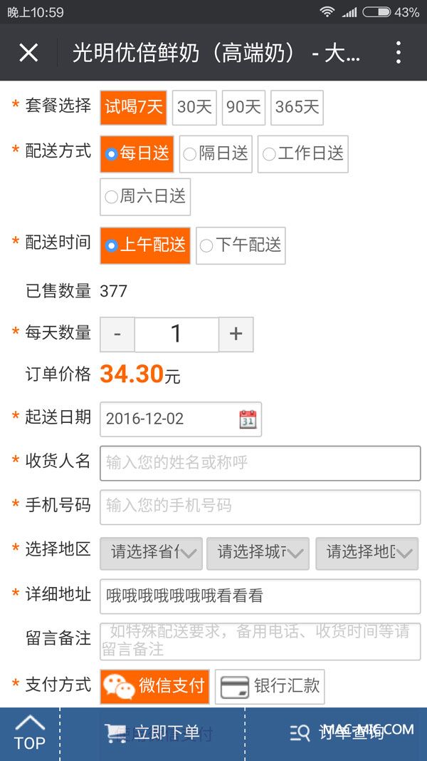 第二步:點(diǎn)擊“在線訂購(gòu)”,確定訂購(gòu)數(shù)量、價(jià)格、種類(lèi)、起送時(shí)間、配送地址等信息,下單后微信付款。