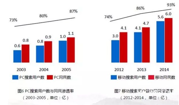 移動(dòng)搜索的發(fā)展歷程與早期的PC很相似,不過(guò)移動(dòng)搜索的發(fā)展更為快速。據(jù)百度2015年初發(fā)布的《移動(dòng)互聯(lián)網(wǎng)發(fā)展趨勢(shì)報(bào)告》顯示,移動(dòng)搜索已成為用戶規(guī)模僅次于社交通信的第二大應(yīng)用垂類,且移動(dòng)用戶的搜索需求(人均搜索次數(shù))呈現(xiàn)穩(wěn)步提升趨勢(shì)。此外,百度移動(dòng)搜索流量也已超過(guò)了PC搜索。