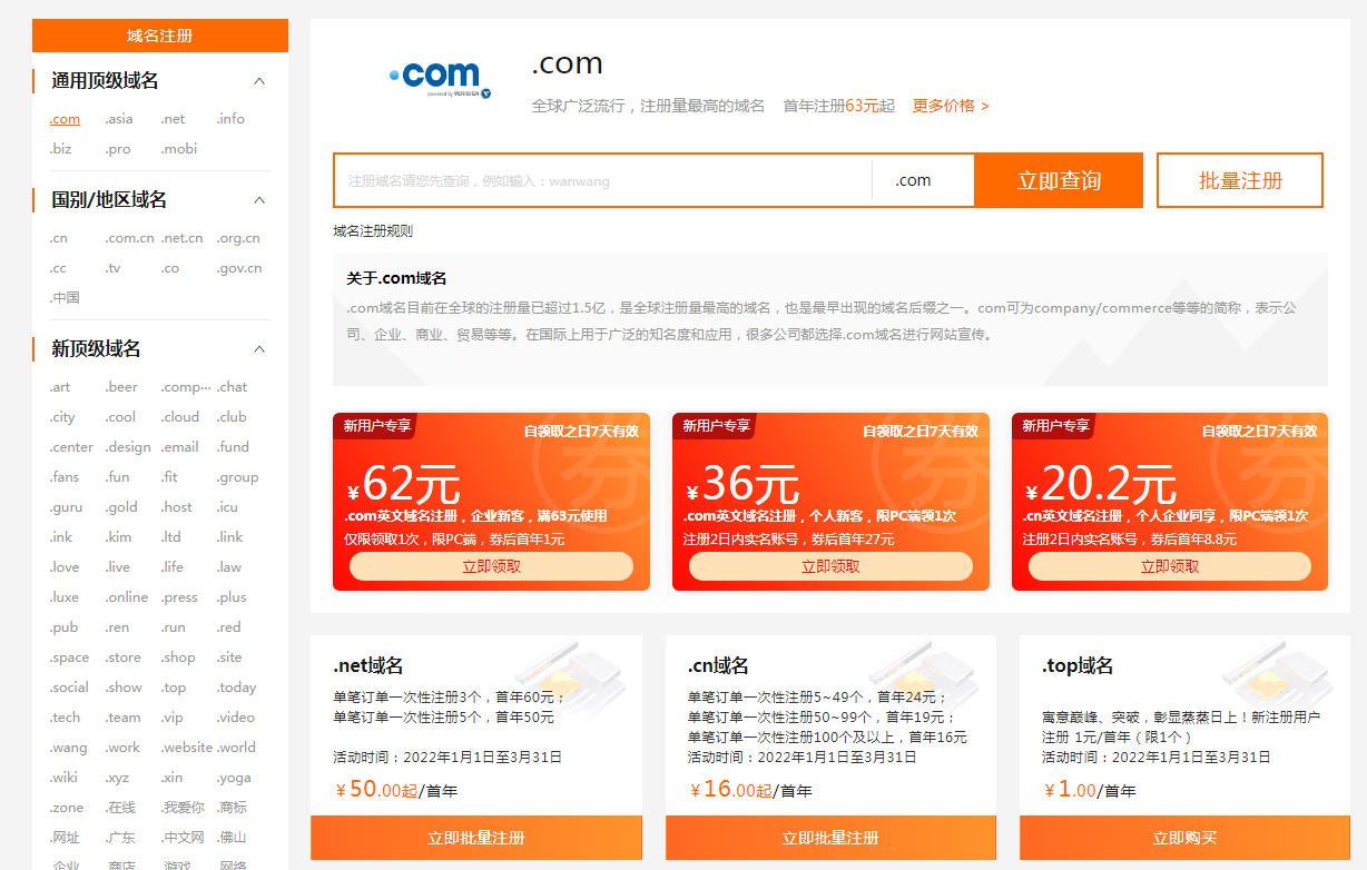 域名(需每年續(xù)費(fèi)) 國(guó)內(nèi)域名注冊(cè)商一共也沒(méi)多少家,全國(guó)比較知名的就阿里云(以前的萬(wàn)網(wǎng))、新網(wǎng)這些的,其他小的注冊(cè)商幾乎都是這些大公司的代理,域名注冊(cè)費(fèi)用每年都在變,但是基本上價(jià)格浮動(dòng)不是很大。